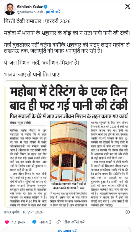 सपा प्रमुख अखिलेश यादव ने एक्स पर एक अखबार की कटिंग शेयर करते हुए लिखा, “महोबा में बीजेपी के भ्रष्टाचार का बोझ पानी की टंकी नहीं उठा पाई। यहां बुलडोजर नहीं चलेगा क्योंकि भ्रष्टाचार की पाइपलाइन महोबा से लखनऊ तक जलापूर्ति की जगह धनापूर्ति कर रही है। यह जल मिशन नहीं, कमीशन मिशन है!” उनके इस बयान ने राजनीतिक गलियारों में हंगामा मचा दिया। विपक्षी दलों ने इसे बीजेपी सरकार की नाकामी का प्रतीक बताते हुए पारदर्शिता और जवाबदेही की मांग तेज कर दी है।