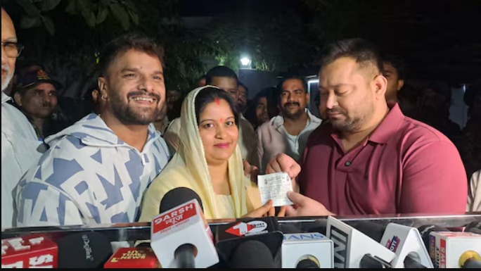 पटना: भोजपुरी सिनेमा के लोकप्रिय अभिनेता और गायक खेसारी लाल यादव ने शुक्रवार को अपनी पत्नी चंदा यादव के साथ औपचारिक रूप से राष्ट्रीय जनता दल (RJD) का दामन थाम लिया। आरजेडी में उनके शामिल होने की घोषणा पार्टी के नेता और पूर्व उपमुख्यमंत्री तेजस्वी यादव ने की। इस मौके पर पार्टी कार्यालय में भारी भीड़ उमड़ी रही। माना जा रहा है कि खेसारी लाल यादव की पत्नी चंदा यादव को आरजेडी इस बार विधानसभा चुनाव में टिकट दे सकती है।