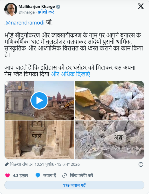 खरगे ने अपनी पोस्ट में लिखा कि बनारस के मणिकर्णिका घाट में बुलडोजर चलाकर धार्मिक, सांस्कृतिक और आध्यात्मिक विरासत को ध्वस्त किया गया है. उन्होंने आरोप लगाया कि पहले काशी विश्वनाथ कॉरिडोर के नाम पर कई छोटे-बड़े मंदिर तोड़े गए और अब प्राचीन घाटों की बारी है. खरगे का कहना है कि सरकार का मकसद इतिहास की हर धरोहर को हटाकर केवल अपनी “नेम प्लेट” लगाना है.