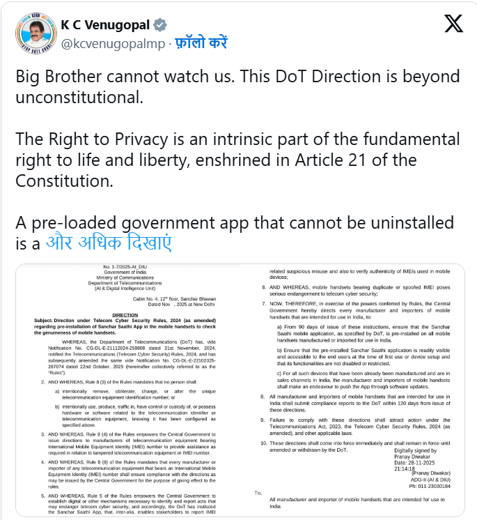 हालांकि इस कदम पर विपक्ष ने तीखी प्रतिक्रिया दी है। राजस्थान के राज्यसभा सांसद के सी वेणुगोपाल ने सोशल मीडिया (एक्स, पूर्व में ट्विटर) पर कहा कि यह आदेश निजता के अधिकार का उल्लंघन है। उन्होंने इसे “बिग ब्रदर” वाला नियंत्रण बताया और कहा कि ऐप एक “मनहूस मशीन” की तरह हर भारतीय की हर गतिविधि पर नजर रखेगा। उनका कहना है कि यह नागरिकों के संवैधानिक अधिकारों पर हमला है और इसे तुरंत वापस लेना चाहिए।